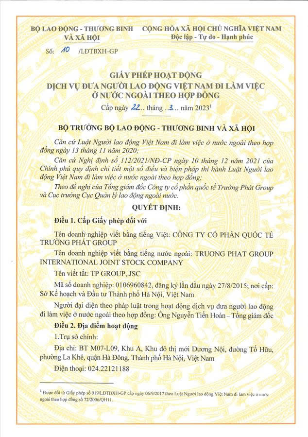 Công ty Cổ phần Quốc tế Trường Phát Group tiền thân là Công ty Cổ phần Nhân lực và Dịch vụ Á Đông được thành lập từ ngày 27.08.2015 và ngày 23.06.2016 được Bộ Lao động, Thương binh và Xã Hội Việt Nam cấp Giấy phép đưa người lao động đi làm việc có thời hạn ở nước ngoài số 843/LĐTBXH-GP. Với mục tiêu phát triển thành công ty đa ngành nghề, ngày 15.12.2022 Công ty Cổ phần Nhân lực và dịch vụ Á Đông đã đổi tên thành Công ty Cổ phần Quốc tế Trường Phát Group và ngày 22.03.2023 được Bộ Lao động, Thương binh và Xã hội Việt nam cấp đổi Giấy phép đưa người lao động đi làm việc có thời hạn ở nước ngoài số 10/LĐTBXH-GP.